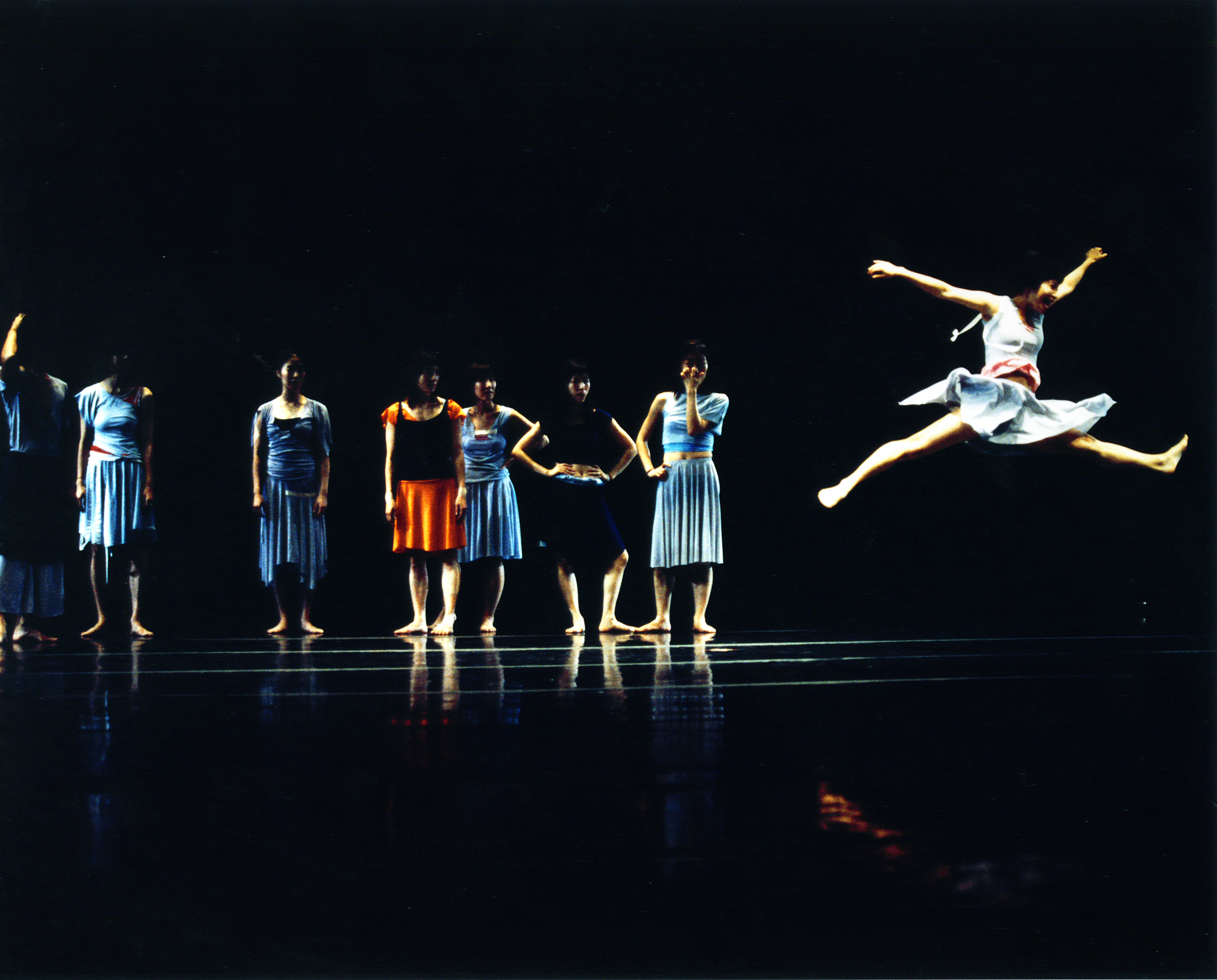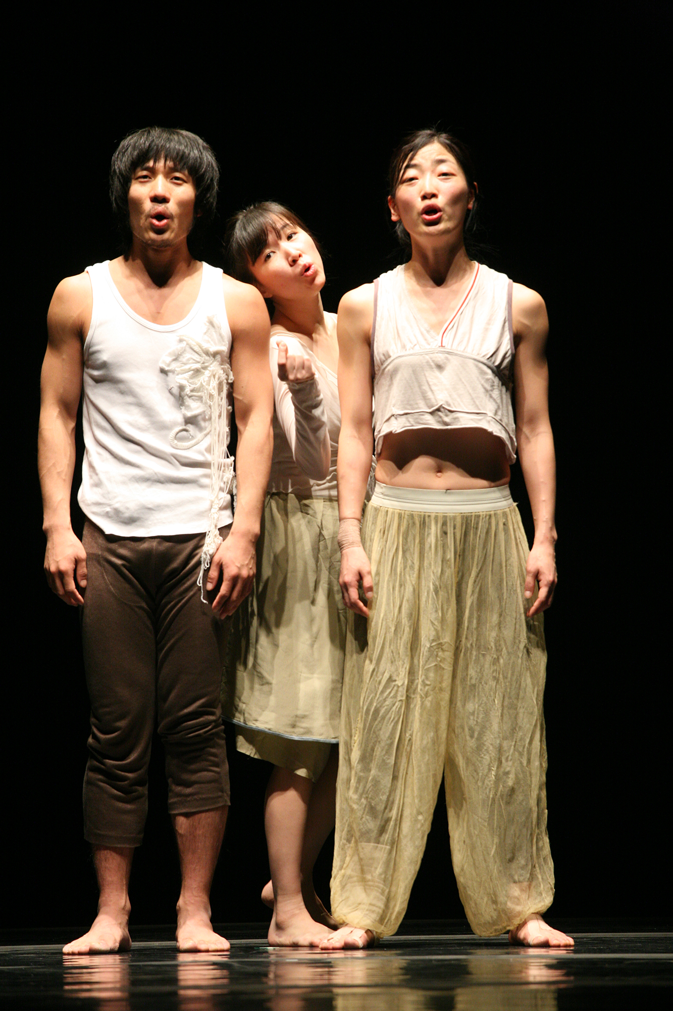 "The Scream of the White Butterfly – Aigo is, as its title suggests, a scream and a cry. Sound becomes gesture, and gesture screams together with sound... There are refined gestures and songs, and also broken, shattered gestures and songs. The dancers run, roll, collide, shout songs at the top of their lungs, and scream. The Scream of the White Butterfly is a scream toward communication." — Kim Seo-in, Dance Forum, March 2003